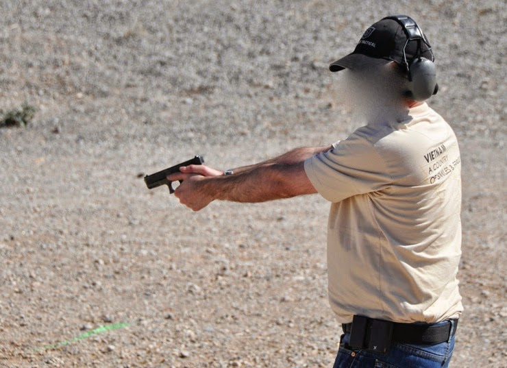Treinamos a resolução de problemas, onde voltei a ter dificuldades com o botão de libertação do carregador da XD na resolução do problema nº3. Os dois outros problemas resolvem-se fácil e rapidamente. O coldre de Kydex da XD tem arestas vivas que me cortam o dedo médio em vários sítios ao retirar a arma do coldre. Depois de um penso rápido, estou como novo. Por esta altura começa a chover e tivemos que fazer uma pausa de quase 2 minutos. Toda a gente em Vegas está surpreendida pelo clima. Aqui só costuma chover e Janeiro e, este ano, em pleno Julho, quando deviam estar cerca de 45 ºC, chove e estão 36 ºC. Eu agradeço a “baixa” temperatura. Apesar disto já tenho um escaldão no pescoço. Pus protetor solar na cara e nos braços, mas esqueci-me do pescoço. Sou oficialmente um “red neck”!